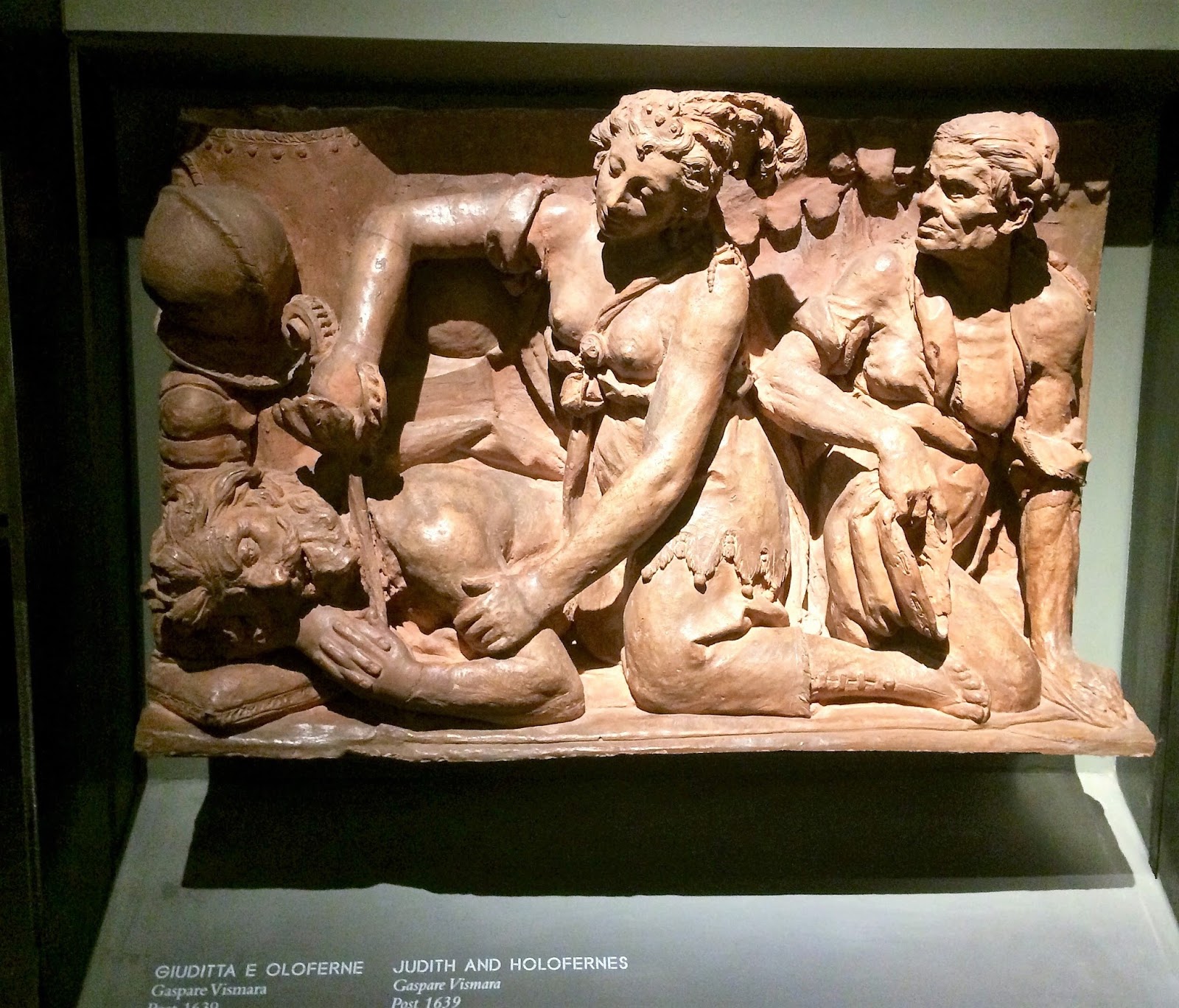 The museum has a large collection of scale models for full-size sculptures.  One set of models depicted religious stories.  The models for each story included a large monochrome painting and a small terra cotta sculpture of the same scene.  Below are the models for the story of Judith and Holofernes.  You might remember the story from an earlier post about Donatello's Judith statue in Florence.  The scene depicted below is a particularly gruesome version of the story because it shows Judith in the act of killing the evil king who sought to destroy her village and people.